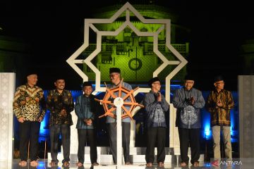 Deputi Gubernur Bank Indonesia, Dody Budi Waluyo (tengah) bersama pejabat Forum Koordinasi Pimpinan Daerah (Forkopimda) Aceh membuka Festival Ekonomi Syariah (FESyar) 2022 di Masjid Raya Baiturrahman, Banda Aceh, Kamis (4/8/2022). Festival Ekonomi Syariah Sumatera bertema Sinergi Ekonomi dan Keuangan Syariah Sumatera untuk Memperkuat Pemulihan Ekonomi Nasional yang Inklusif pada 4 - 6 Agustus 2022 tersebut dimeriahkan dengan festival budaya, pameran UMKM kuliner, UMKM fashion dan craft serta fashion chamber. ANTARA FOTO/Ampelsa/foc.