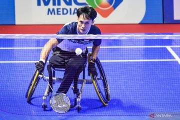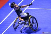 Pebulu tangkis Indonesia Wiwin Adri berusaha mengembalikan kok ke arah lawannya sesama pebulu tangkis Indonesia Agus Budi Utomo pada final tunggal putra WH2 ASEAN Para Games 2022 di Edutorium UMS, Solo, Jawa Tengah, Jumat (5/8/2022). Wiwin Adri menang dengan skor 2-0 (21-13, 21-8). ANTARA FOTO/Mohammad Ayudha/foc.