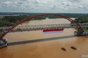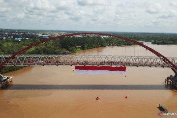 Foto udara sebuah bendera merah putih dibentangkan di Jembatan Kahayan, Palangka Raya, Kalimantan Tengah, Sabtu (6/8/2022). Aksi pembentangan bendera merah putih sepanjang 40 x 8 meter tersebut diikuti oleh TNI, Polri, Basarnas, BPBD, dan relawan ERP yang bertujuan untuk menumbuhkan rasa jiwa nasionalisme kepada generasi muda serta menyemarakkan HUT ke-77 Kemerdekaan Republik Indonesia. ANTARA FOTO/Makna Zaezar/hp.