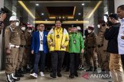 Ketua Umum DPP Partai Golkar Airlangga Hartarto (tengah), Ketua Umum DPP PAN Zulkifli Hasan (kiri), dan Ketua Umum DPP PPP Suharso Monoarfa (kanan) bertumpu tangan bersama usai melakukan Pendaftaran Partai Politik Calon Peserta Pemilu tahun 2024 di Gedung KPU, Jakarta, Rabu (10/8/2022). Koalisi Indonesia Bersatu (KIB) yang terdiri dari Partai Golkar, PAN dan PPP telah resmi mendaftar sebagai calon peserta Pemilu 2024 ke KPU. ANTARA FOTO/Aprillio Akbar/aww.