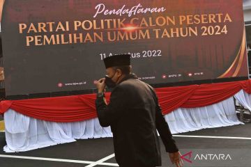 Warga melintas di depan layar digital pendaftaran Partai Politik Calon Peserta Pemilu 2024 di Gedung KPU, Jakarta, Kamis (11/8/2022). Hingga Kamis (11/8), sebanyak 23 Parpol telah terdaftar, 17 di antaranya dinyatakan berkasnya lengkap dan dilanjutkan ke dalam tahapan verifikasi administrasi. ANTARA FOTO/Aditya Pradana Putra/wsj.
