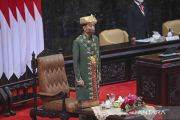 Presiden Joko Widodo memberi salam usai menyampaikan pidato kenegaraan pada Sidang Tahunan MPR dan Sidang Bersama DPR - DPD Tahun 2022 di Gedung Nusantara, Kompleks Parlemen, Senayan, Jakarta, Selasa (16/8/2022). ANTARA FOTO/Galih Pradipta/wsj.