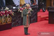Presiden Joko Widodo mengenakan pakaian adat Baju Paksian asal Provinsi Bangka Belitung saat menghadiri Sidang Tahunan MPR dan Sidang Bersama DPR - DPD Tahun 2022 di Gedung Nusantara, Kompleks Parlemen, Senayan, Jakarta, Selasa (16/8/2022). ANTARA FOTO/Galih Pradipta/wsj.