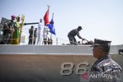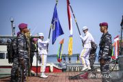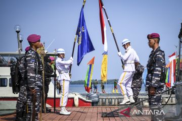 Danpasmar 1 Brigjen TNI (Mar) Hermanto (kanan) menyambut kedatangan KRI Sikuda-863 yang membawa Bendera Merah Putih yang akan dikibarkan di bawah laut saat tiba di Dermaga Pulau Putri, Kepulauan Seribu, Jakarta, Selasa (16/8/2022). TNI AL secara serentak akan melakukan upacara pengibaran bendera merah putih di bawah laut di 77 lokasi di sejumlah lokasi yang dilaksanakan pada tanggal 17 Agustus 2022 dalam rangka memeriahkan HUT Kemerdekaan RI ke-77. ANTARA FOTO/M Risyal Hidayat/aww.