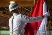 Prajurit Korps Marinir merapikan Bendera Merah Putih yang akan dikibarkan di bawah laut tiba di Pulau Putri, Kepulauan Seribu, Jakarta, Selasa (16/8/2022). TNI AL secara serentak akan melakukan upacara pengibaran bendera merah putih di bawah laut di 77 lokasi di sejumlah lokasi yang dilaksanakan pada tanggal 17 Agustus 2022 dalam rangka memeriahkan HUT Kemerdekaan RI ke-77. ANTARA FOTO/M Risyal Hidayat/aww.