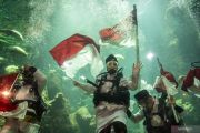 Penyelam mengibarkan bendera Merah Putih dalam rangka memperingati HUT Ke-77 Kemerdekaan RI di Sea World, Ancol, Jakarta, Rabu (17/8/2022). Pengibaran bendera Merah Putih di bawah air tersebut guna menunjukkan semangat nasionalisme serta mengajak masyarakat untuk menjaga keberadaan ekosistem bawah laut. ANTARA FOTO/Muhammad Adimaja/foc.
