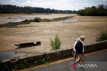 Foto udara menunjukkan cabang Sungai Loire saat kekeringan parah melanda Prancis, di Loireauxence, Prancis, (16/8/2022). ANTARA FOTO/REUTERS/Stephane Mahe/aww.