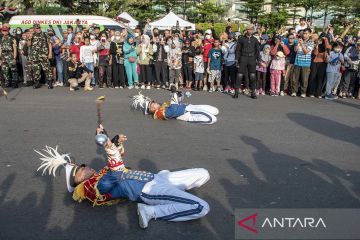 Sejumlah Taruna Akademi TNI Akmil, AAU dan AAL melakukan atraksi saat kirab drumband Akademi TNI di kawasan Bundaran HI, Jakarta, Minggu (21/8/2022). Kirab tersebut diselenggarakan dalam rangka memeriahkan HUT ke-77 Kemerdekaan RI. ANTARA FOTO/Muhammad Adimaja/aww.