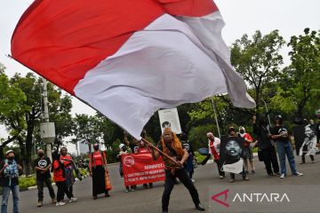 Aktivis Forum Seniman Peduli Taman Ismail Marzuki (TIM) melakukan aksi menolak pengelolaan TIM oleh Jakpro di Jalan Medan Merdeka Utara menuju Kantor Mahkamah Agung (MA), Jakarta, Senin (22/8/2022). Aksi tersebut juga diikuti dengan pengajuan gugatan uji materiil kepada MA terhadap Peraturan Gubernur DKI Nomor 63 Tahun 2019 juncto Nomor 16 Tahun 2022 yang memberikan kewenangan kepada PT Jakarta Propertindo (Jakpro) untuk mengelola Pusat Kesenian Jakarta TIM. ANTARA FOTO/Aditya Pradana Putra/rwa.