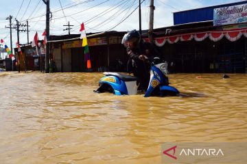 Pengendara sepeda motor menerobos banjir di Jalan Basuki Rahmat Kota Sorong, Papua Barat, Selasa (23/8/2022). BPBD Kota Sorong menyebutkan bencana banjir dan tanah longsor yang terjadi sejak Selasa (23/8) dini hari di wilayah tersebut mengakibatkan dua orang meninggal dunia, satu orang luka berat dan 9.000 KK mengungsi. ANTARA FOTO/Olha Mulalinda/aww.