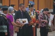 Ayah dari almarhum Brigadir Nopriyansyah Yosua Hutabarat atau Brigadir J, Samuel Hutabarat (kanan) didampingi istri Rosti Simajuntak (ketiga kanan) menerima ucapan selamat atas kelulusan anaknya dari Rektor Universitas Terbuka Ojat Darojat (kiri) saat acara prosesi wisuda di Kampus Universitas Terbuka Pondok Cabe, Tangerang Selatan, Banten, Selasa (23/8/2022). Almarhum Brigadir Yosua diwisuda bersama 2499 mahasiswa lainnya sebagai Sarjana Ilmu Hukum oleh Universitas Terbuka. ANTARA FOTO/Muhammad Iqbal/foc.