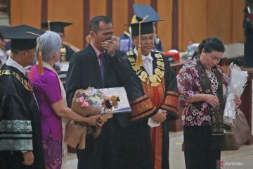 Ayah dari almarhum Brigadir Nopriyansyah Yosua Hutabarat atau Brigadir J, Samuel Hutabarat (ketiga kiri) didampingi istri Rosti Simajuntak (kanan) menahan tangis usai menerima ijazah kelulusan anaknya dari Rektor Universitas Terbuka Ojat Darojat (kiri) saat acara prosesi wisuda di Kampus Universitas Terbuka Pondok Cabe, Tangerang Selatan, Banten, Selasa (23/8/2022). Almarhum Brigadir Yosua diwisuda bersama 2499 mahasiswa lainnya sebagai Sarjana Ilmu Hukum oleh Universitas Terbuka. ANTARA FOTO/Muhammad Iqbal/foc.