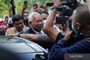 Mantan Perdana Menteri Malaysia Najib Tun Razak menjawab sejumlah pertanyaan wartawan saat rehat sidang di gedung Pengadilan Mahkamah Persekutuan di Putrajaya, Malaysia, Selasa (23/8/2022). Najib Tun Razak mulai menjalani hukuman 12 tahun di Penjara Kajang setelah panel hakim Mahkamah Persekutuan menolak upaya banding yang diajukan terkait kasus penyalahgunaan dana SRC International Sdn Bhd sebesar 42 juta ringgit Malaysia (Rp183,85 miliar). ANTARA FOTO/REUTERS/Lai Seng Sin/wsj.