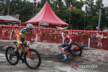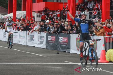 Pembalap sepeda MTB asal Prancis Quentin Schroztzenberger (kanan) melakukan selebrasi setelah berhasil mencapai garis finish pada ajang Seri ke-8 UCI MTB Eliminator World Cup 2022 kategori Men Elite di area Stadion Toah Pahoe, Palangka Raya, Kalimantan Tengah, Minggu (28/8/2022). Pembalap Prancis Quentin Schroztzenberger berhasil meraih juara pertama, disusul juara dua Simon Gegenheimer asal Jerman, juara tiga Metahsit Boonsane asal Thailand, Riyadh Hakim Lukman asal Singapura dan Ihza Muhammad asal Indonesia. ANTARA FOTO/Makna Zaezar/aww.