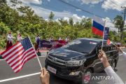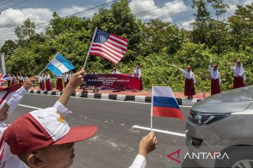 Sejumlah siswa SDN 45 Tanjungpandan mengibarkan bendera saat menyambut kedatangan perwakilan delegasi Development Working Group (DWG) G20 dari berbagai negara di Belitung, Kepulauan Bangka Belitung, Selasa (6/9/2022). Pertemuan tingkat menteri DWG G20 tersebut akan membahas soal pembangunan berkelanjutan berbasis masyarakat dan bernuasa maritim, yang akan dilaksanakan pada 7-9 September 2022. ANTARA FOTO/Muhammad Adimaja/rwa.