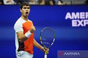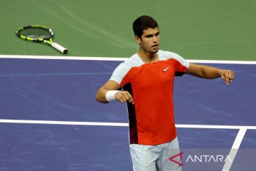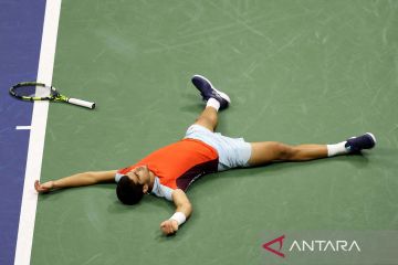 Petenis Spanyol Carlos Alcaraz mengekspresikan kegembiraannya seusai laga babak semifinal turnamen tenis US Open 2022 melawan petenis AS Frances Tiafoe di Flushing, New York, AS (9/9/2022). Setelah bermain selama lima set, akhirnya Carlos Alcaraz berhasil memenangi pertandingan dengan skor 6(6)-7(8), 6-3, 6-1, 6(5)-7(7), 6-3 dan melaju ke babak final US Open 2022. ANTARA FOTO/Robert Deutsch-USA TODAY Sports/aww.