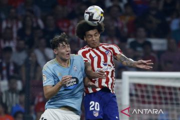 Pesepak bola Celta Vigo Jorgen Strand Larsen (kiri) berebut bola dengan pesepak bola Atletico Madrid Axel Witse dalam laga pekan kelima Liga Spanyol, di Metropolitano, Madrid, Spanyol, Sabtu (10/9/2022). Atletico Madrid berhasil menglaahkan Celta Vigo 4-1. ANTARA FOTO/Reuters-Susana Vera/hp.
