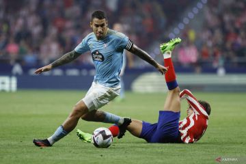 Pesepak bola Celta Vigo Hugo Mallo (kiri) berebut bola dengan pesepak bola Atletico Madrid Joao Felix dalam laga pekan kelima Liga Spanyol, di Metropolitano, Madrid, Spanyol, Sabtu (10/9/2022). Atletico Madrid berhasil mengalahkan Celta Vigo 4-1. ANTARA FOTO/Reuters-Susana Vera/hp.