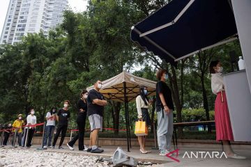 Warga antre mengikuti tes COVID-19 di bilik pengujian di Beijing, China, Selasa (13/9/2022). ANTARA FOTO/REUTERS/Thomas Peter/rwa.
