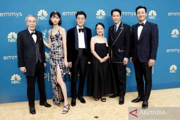 Sejumlah bintang drama serial Squid Game Lee Jung-Jae, Jung Ho-Yeon, Park Hae-Soo, Oh Young-Soo dan Sutradara Hwang Dong-Hyuk berpose saat tiba di lokasi acara malam puncak penghargaan Emmy Awards 2022 di Microsoft Theater, Los Angeles, Amerika Serikat, Senin (12/9/2022). Squid Game mencatat sejarah baru dengan menambah dua piala Emmy Awards 2022 yakni Aktor Utama Pria dan Sutradara Terbaik sehingga totalnya menjadi enam. Peraihan tersebut membuat serial asli Netflix berbahasa Korea itu menjadi program non-Inggris pertama yang pernah memenangkan penghargaan TV paling bergengsi di Amerika Serikat. ANTARA FOTO/REUTERS/Ringo Chiu/wsj.