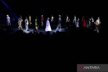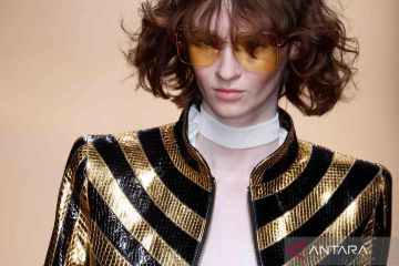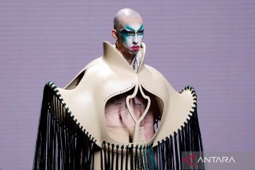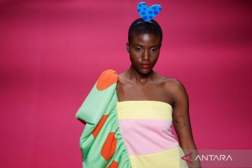 Seorang model memperagakan busana rancangan Agatha Ruiz de la Prada di Mercedes Benz Fashiow Week, Madrid, Spanyol, Jumat (16/9/2022). ANTARA FOTO/REUTERS/Susana Vera/wsj.
