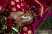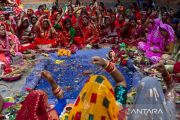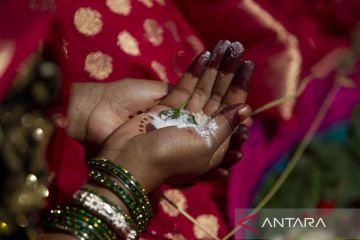 Seorang wanita mengenakan pakaian tradisional memanjatkan doa dalam Festival Jitiya di Kathmandu, Nepal, Minggu (18/9/2022). Festival Jitiya sebagian besar dirayakan oleh wanita dari komunitas Tharu yang sudah menikah, memohonkan kesejahteraan bagi suami dan putra-putra mereka dengan menjalankan puasa tanpa minum air. ANTARA FOTO/Xinhua/Sulav Shrestha/rwa.