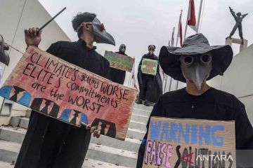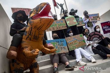 Aktivis dari Koalisi Jeda untuk Iklim, XR Indonesia, BEM FMIPA UI dan organisasi kaum muda melakukan aksi kreatif "Global Climate Strike (GCS)" di Taman Lapangan Banteng, Jakarta, Jumat (23/9/2022). Aksi yang mengkritisi persoalan krisis iklim dan dampaknya tersebut mengusung tema #PeopleNotProfit. ANTARA FOTO/Aprillio Akbar/wsj.