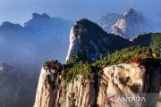 Foto udara pemandangan Gunung Huashan saat matahari terbenam di Provinsi Shaanxi, China barat laut, Minggu (25/9/2022). Gunung tersebut memiliki trek pendakian ekstrim sehingga disebut sebagai The Road to Heaven. ANTARA FOTO/Xinhua/Tao Ming/rwa.