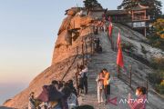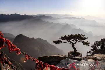 Sejumlah wisatawan menikmati pemandangan matahari terbenam di Gunung Huashan di Provinsi Shaanxi, China barat laut, Minggu (25/9/2022). ANTARA FOTO/Xinhua/.Zou Jingyi/rwa.