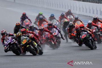 Sejumlah pembalap memacu kecepatan pada balapan MotoGP Thailand Grand Prix di Chang International Circuit, Buriram, Thailand, Minggu (2/10/2022). Miguel Oliveira berhasil menjadi juara pertama dengan diikuti duo pembalap Ducati Lenovo Jack Miller dan Francesco Bagnaia. ANTARA FOTO/REUTERS/Athit Perawongmetha/aww.