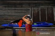 Seorang anak lelaki bermain di jalanan saat banjir di dekat masjid Tha-it, pinggiran Provinsi Nonthaburi, Bangkok, Thailand, Selasa (4/10/2022). ANTARA FOTO/REUTERS/Chalinee Thirasupa/rwa.