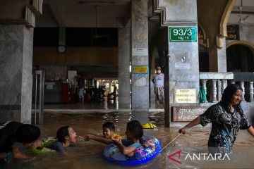 Sejumlah anak bermain di jalanan yang terendam banjir di dekat masjid Tha-it, pinggiran Provinsi Nonthaburi, Bangkok, Thailand, Selasa (4/10/2022). ANTARA FOTO/REUTERS/Chalinee Thirasupa/rwa.