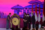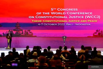 Presiden Joko Widodo (kiri) memukul gong didampingi Ketua Mahkamah Konstitusi (MK) Anwar Usman (kedua kiri), Special Representative of the Venice Commission Gianni Buquicchio (kanan), Menteri Luar Negeri Retno Marsudi (tengah) dan Gubernur Bali Wayan Koster (kedua kanan) saat Pembukaan Kongres ke-5 the World Conference on Constitustional Justice (WCCJ) di Nusa Dua, Badung, Bali, Rabu (5/10/2022). Kongres kelima peradilan konstitusi sedunia yang mengambil tema "Constitutional Justice and Peace" itu menjadi forum diskusi dan berbagi pengalaman serta praktik terbaik terkait peradilan konstitusi antar anggota WCCJ. ANTARA FOTO/Fikri Yusuf/hp.