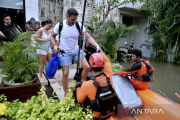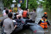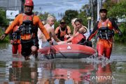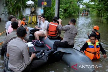 Tim SAR mengevakuasi wisatawan mancanegara (wisman) yang terjebak banjir menggunakan perahu karet di kawasan Seminyak, Badung, Bali, Sabtu (8/10/2022). Tim SAR gabungan mengevakuasi puluhan wisman dari sejumlah vila yang terendam banjir dengan ketinggian sekitar 1,5 meter di kawasan pariwisata itu akibat hujan yang mengguyur Bali sejak Jumat (7/10). ANTARA FOTO/Fikri Yusuf/rwa.