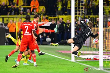 Kiper Bayern Munich Manuel Neuer gagal menahan sundulan pemain Borussia Dortmund Anthony Modeste pada menit 95 dalam laga Liga Jerman di Signal Iduna Park, Dortmund, Jerman, Sabtu (8/10/2022). Laga itu berakhir imbang 2-2. ANTARA FOTO/REUTERS/Benjamin Westhoff/foc.