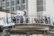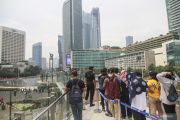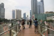 Sejumlah warga berfoto di anjungan Halte Transjakarta Bundaran HI saat uji coba anjungan itu di kawasan Bundaran Hotel Indonesia, Jakarta, Minggu (9/10/2022). Anjungan yang berada di lantai dua Halte Transjakarta Bundaran HI ini dapat menampung 20 orang dan menjadi spot foto baru dengan latar belakang Patung Selamat Datang dan air mancur Bundaran HI. ANTARA FOTO/Asprilla Dwi Adha/foc.