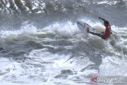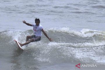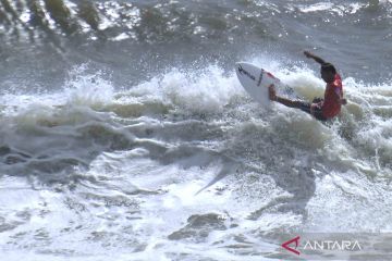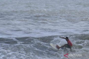 Peselancar klub Halfway Boardriders Dedi Santosa bertanding dalam babak final divisi Master Grand Final Nasional Liga Surfing Indonesia (LSI) 2022 di Pantai Pererenan, Badung, Bali, Minggu (9/10/2022). Dedi Santosa berhasil menjuarai divisi Master Liga Surfing Indonesia 2022 diikuti peselancar klub Pererenan Boardriders I Made Nuada dan peselancar Herman dari Medewi Boardriders di posisi ketiga. ANTARA FOTO/Fikri Yusuf/wsj.