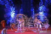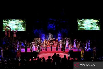 Seniman dari Komunitas Seni Arjuna Production menampilkan pagelaran kolosal berjudul "Sangaskara Abimantrana Thirta Dakara, Restu dan Berkah Air Sepanjang Kehidupan" saat pembukaan Festival Seni Bali Jani (FSBJ) IV Tahun 2022 di panggung terbuka Ardha Candra, Taman Budaya Bali, Denpasar, Bali, Minggu (9/10/2022). Festival yang digelar oleh Pemerintah Provinsi Bali dengan mengusung tema "Jaladhara Sasmita Danu Kerthi, Air sebagai Sumber Peradaban" tersebut melibatkan sekitar 2.000 seniman, kreator dan pelaku seni yang berlangsung pada 9-23 Oktober 2022. ANTARA FOTO/Nyoman Hendra Wibowo/wsj.