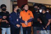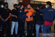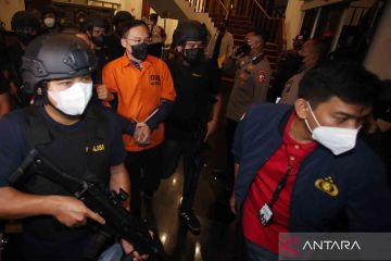 Petugas kepolisian memperlihatkan tersangka bandar besar judi online Apin Bak Kim alias Apin BK setibanya dari Malaysia di Bandara Soekarno Hatta, Tangerang, Banten, Jumat (14/10/2022). Polri berhasil menangkap buronan Apin BK di Malaysia setelah sebelumnya melarikan diri ke Singapura. ANTARA FOTO/Muhammad Iqbal/wsj.