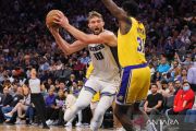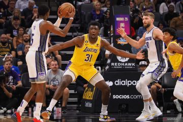 Pebasket Sacramento Kings Domantas Sabonis (kiri) berupaya melepaskan diri dari penjagaan pebasket Los Angeles Lakers Thomas Bryant (kanan) dalam laga Pramusim NBA, di Golden 1 Center; Sacramento, California, Amerika Serikat, Jumat (14/10/2022). Sacramento Kings berhasil mengalahkan Los Angeles Lakers 133 -86. ANTARA FOTO/Reuters- Kelley L Cox-USA TODAY Sports/hp.