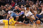 Pebasket Los Angeles Lakers Thomas Bryant (tengah) menghadang serangan pebasket Sacramento Kings De'Aaron Fox (kiri) dalam laga Pramusim NBA, di Golden 1 Center; Sacramento, California, Amerika Serikat, Jumat (14/10/2022). Sacramento Kings berhasil mengalahkan Los Angeles Lakers 133 -86. ANTARA FOTO/Reuters- Kelley L Cox-USA TODAY Sports/hp.