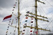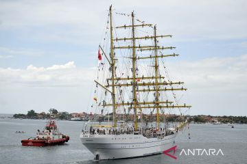 Prajurit TNI AL dan keluarga Taruna Akademi Angkatan Laut (AAL) Tingkat III Angkatan ke-69 melepas KRI Bima Suci-945 saat melanjutkan pelayaran di Pelabuhan Benoa, Denpasar, Bali, Minggu (16/10/2022). Kapal Layar Latih Akademi Angkatan Laut KRI Bima Suci-945 yang tiba di Bali pada Selasa (11/10) dalam rangkaian melaksanakan pendidikan taruna serta menjalankan misi diplomasi dan budaya selama 84 hari tersebut kembali melanjutkan pelayaran menuju Surabaya, Jawa Timur. ANTARA FOTO/Nyoman Hendra Wibowo/aww.