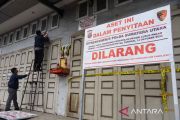 Petugas dari Direktorat Reserse Kriminal Khusus (Ditreskrimsus) Polda Sumut menyita sejumlah aset milik tersangka bandar judi daring Apin BK di Komplek Cemara Asri, Percut Sei Tuan, Deli Serdang, Sumatera Utara, Selasa (18/10/2022). Setelah sempat melakukan penyitaan pada Senin (17/10), Polda Sumut kembali menyita lima aset milik Apin BK berupa dua unit rumah mewah, dua unit 'show room' mobil, dan satu unit kafe dengan nilai total Rp73 miliar. ANTARA FOTO/Fransisco Carolio/rwa.