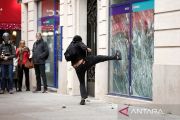 Seorang demonstran menghancurkan jendela bank selama bentrokan di sebuah demonstrasi di Paris sebagai bagian dari hari pemogokan nasional dan protes untuk upah yang lebih tinggi di Prancis, (18/10/2022). ANTARA FOTO/REUTERS/Benoit Tessier/aww.