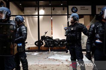 Polisi Prancis mengamankan showroom BMW yang hancur selama bentrokan di sebuah demonstrasi di Paris sebagai bagian dari hari pemogokan nasional dan protes untuk upah yang lebih tinggi di Prancis, (18/10/2022). ANTARA FOTO/REUTERS/Benoit Tessier/aww.