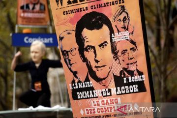 Sebuah poster dengan potret Presiden Prancis Emmanuel Macron digambarkan di sebelah seorang pemrotes mengenakan topeng yang menggambarkan Bernard Arnault, ketua LVMH Moet Hennessy Louis Vuitton, selama demonstrasi di Paris sebagai bagian dari hari pemogokan nasional dan protes untuk upah yang lebih tinggi di Prancis, (18/10/2022). ANTARA FOTO/REUTERS/Benoit Tessier/aww.