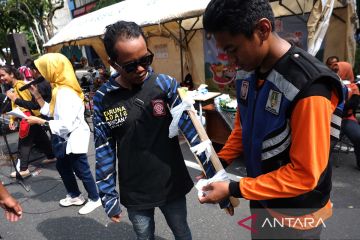 Anggota Taruna Siaga Bencana (Tagana) Solo memberikan sosialisasi penanganan korban akibat gigitan ular berbisa kepada warga saat pelaksanaan Hari Bebas Kendaraan Bermotor atau Car Free Day (CFD) di Solo, Jawa Tengah, Minggu (23/10/2022). Sosialisasi tersebut untuk mengedukasi warga agar dapat mengambil tindakan yang tepat dalam penanganan korban akibat gigitan ular secara mandiri. ANTARA FOTO/Maulana Surya/rwa.