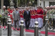 Menhan Prabowo Subianto (kiri) menerima kunjungan Perdana Menteri (PM) Palestina Mohammed Ibrahim Shtayyeh (kedua kiri) di halaman Kementerian Pertahanan, Jakarta, Rabu (26/10/2022). Pertemuan tersebut diselenggarakan dalam rangka meningkatkan hubungan keamanan kedua negara. ANTARA FOTO/Muhammad Adimaja/foc.