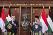 Perdana Menteri (PM) Palestina Mohammed Ibrahim Shtayyeh (kiri) memberikan keterangan kepada media bersama Menhan Prabowo Subianto (kanan) usai pertemuan di Kementerian Pertahanan, Jakarta, Rabu (26/10/2022). Pertemuan tersebut diselenggarakan dalam rangka meningkatkan hubungan keamanan kedua negara. ANTARA FOTO/Muhammad Adimaja/foc.
