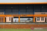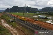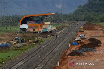 Petugas membersihkan area Stasiun Rammang-Rammang di Kabupaten Maros, Sulawesi Selatan, Kamis (27/10/2022). Pembangunan rel kereta api sepanjang 144 kilometer tersebut merupakan salah satu proyek prioritas strategis Rencana Pembangunan Menengah Nasional (RPJMN) 2020-2024 dengan nilai investasi mencapai Rp8,25 triliun dan ditargetkan rampung pada 2024. ANTARA FOTO/Arnas Padda/aww.